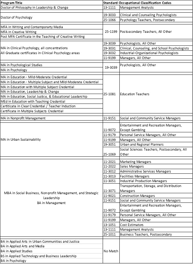 Job Classification Codes for Gainful Employment